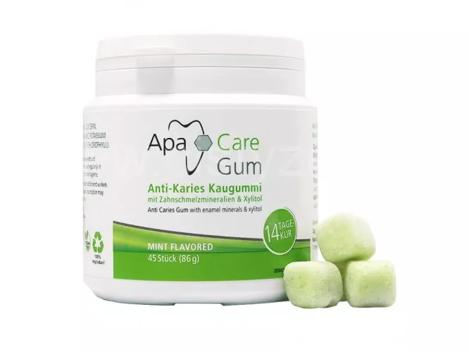 Žvýkačky s xylitolem a minerály zubní skloviny ApaCare chrání před vznikem zubního plaku a pomáhají remineralizovat sklovinu. Neobsahují cukr a mají osvěžující příchuť máty.