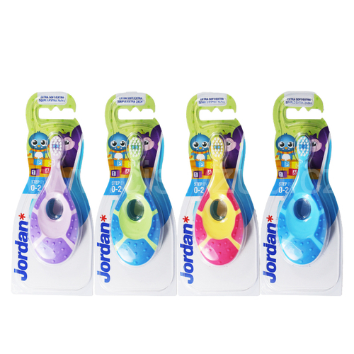 Jordan Step 1 baby je kombinace dětského zubního kartáčku a kousátka. Má malou oválnou hlavičku s měkkými vlákny, krátký krček kartáčku a široké držátko zabraňuje hlubšímu zavedení do úst, strukturované držátko slouží jako kousátko. Napomáhá správnému návyku dětí na ústní hygienu. Je vhodný pro čištění již od prvního zoubku do 2 let.