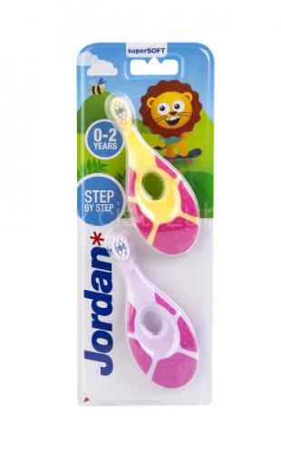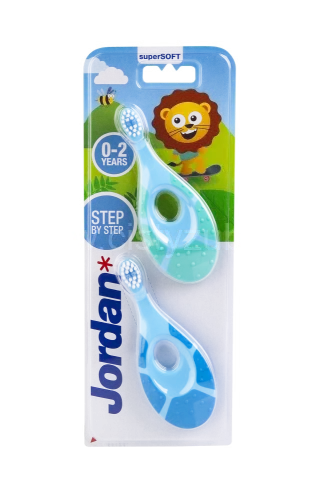 Jordan Step 1 baby je kombinace dětského zubního kartáčku a kousátka. Má malou oválnou hlavičku s měkkými vlákny, krátký krček kartáčku a široké držátko zabraňuje hlubšímu zavedení do úst, strukturované držátko slouží jako kousátko. Napomáhá správnému návyku dětí na ústní hygienu. Je vhodný pro čištění již od prvního zoubku do 2 let.